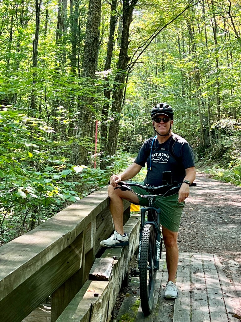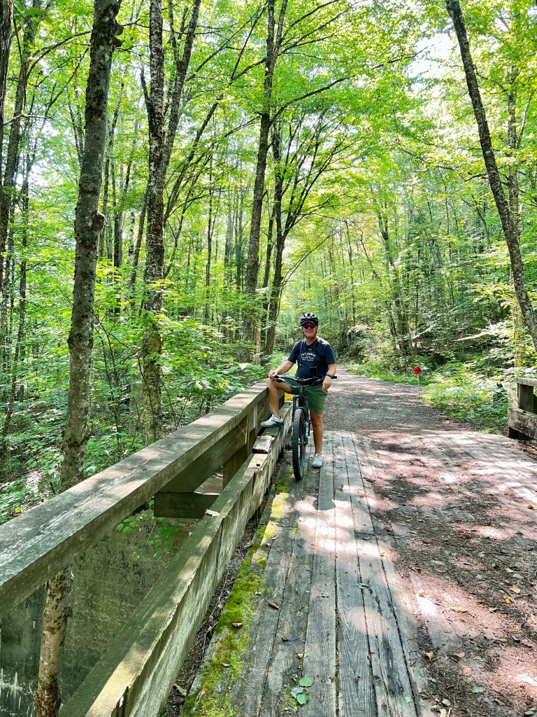A full day to explore Groton State Park which Ricker Pond is a part of. Vermont had a trial system that apparently goes all the way through the state. It is well maintained and it is shaded by trees. Because it is fairly flat, you feel like you can go on forever. You could Groton Lake from the trail so we decided to explore the beach area. There was lots of fun being had. Jet skis, paddle boarding, kayaking, swimming, fishing. The 17 mile ride pooped us out so we spent a good part of the day reading. Dan s reading a Tiger Woods biography and I am reading Overstory. We met our neighbors today and they are traveling around in their RV and playing disc golf. We are becoming more and more interested in that sport. No service for the 2nd day in a row. We seem to relax more when we can’t use our phones.
