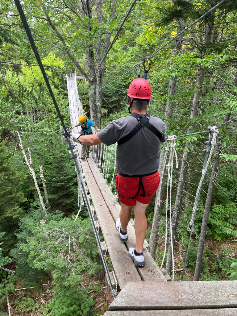 We have been anticipating this day for a long time. I am a zipline junkie. So we planned a zip lining experience with Dans cousins at Bretten Woods, which is a ski area in New Hampshire. The canopy tour includes a network of platforms high up in the ancient hemlock trees connected by nine ziplines, two sky bridges and three rappels. It was thrilling and awe inspiring. Right after we went to the Mount Washington Hotel to have a drink on the back patio. Afterwards we hosted a dinner at our new campground Twin Mountains on the Ammonoosuc River. What a fun day!