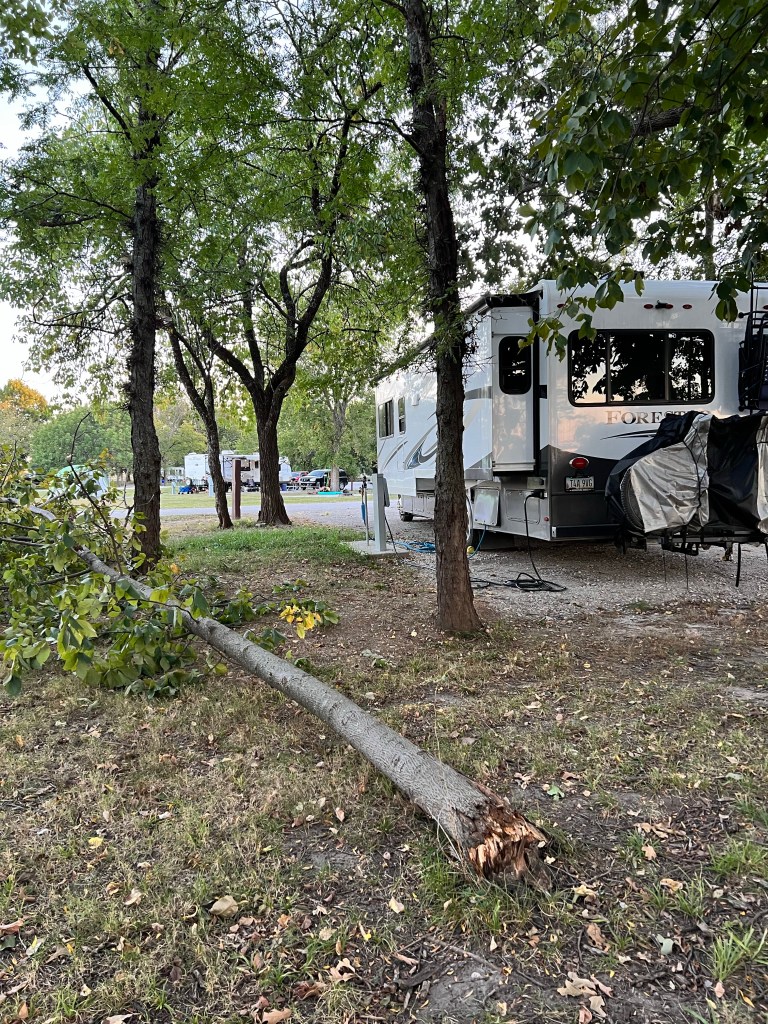 Hillsdale State Park in Paola, Kansas. is our stop today. We are in a spot right on Hillsdale Lake. A tree near our campsite fell, out of the blue, kinda weird. Many of the campers at this campground are staying the maximum amount of time; it makes me curious. This may be the last spot we see a big body of water as we continue heading west. Whatever will we do?