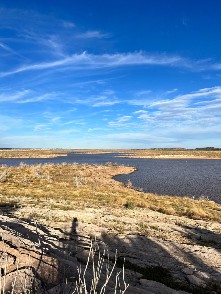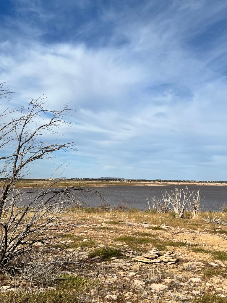 Santa Rosa State Park Campground in New Mexico. We went through Kansas, Oklahoma, Texas and New Mexico today. Long trip. This campground has a lake as well, what do you know. We can tell we are out west again. It is dry, full of brush and cactus. We did the Shoreline hike around part of the lake. Definitely a desert hike.