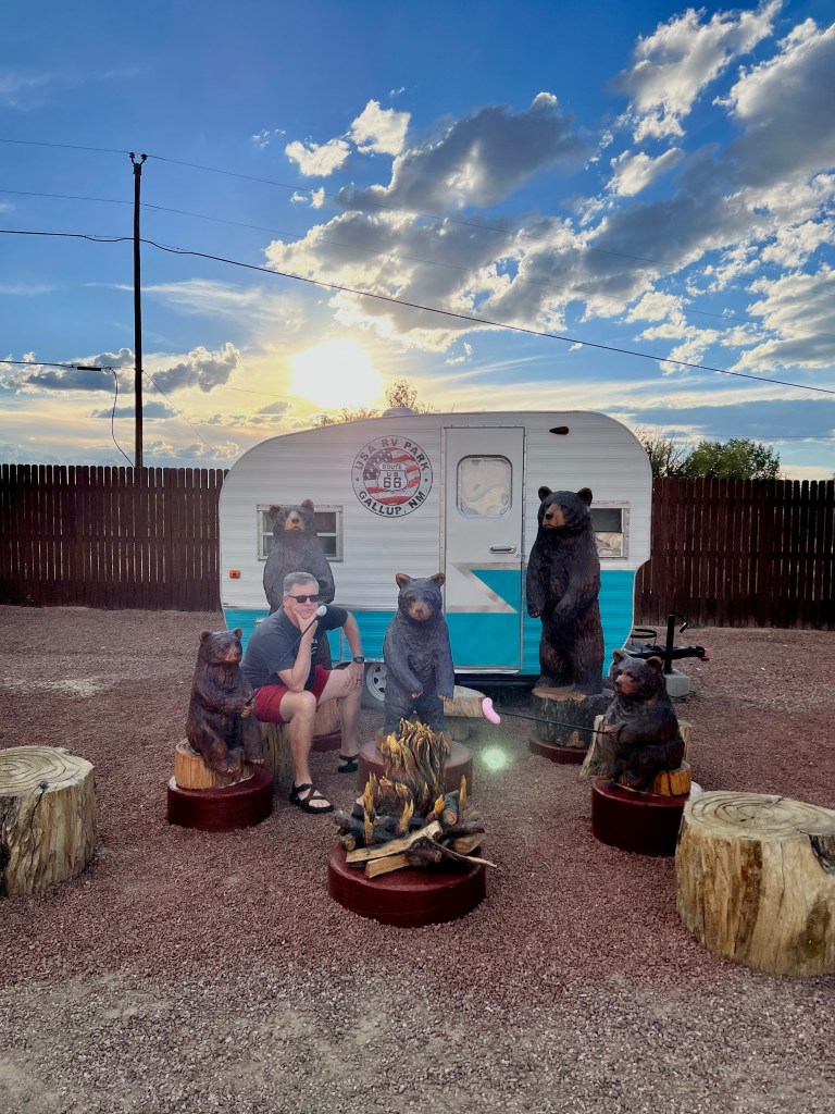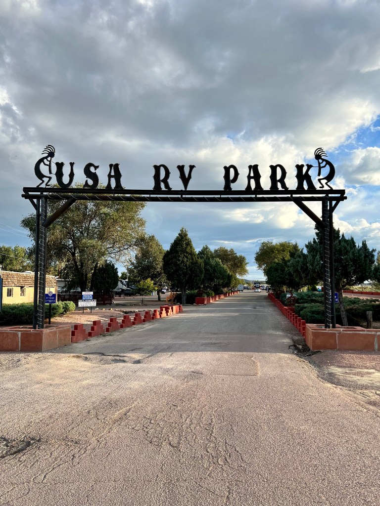 We decided to try something new and stay at an RV park right off the I-40. In Gallup, New Mexico. It is like spending the night in a drive-in theater. We sprang for their b-bque dinner and apple cobbler, there really isn’t anywhere to take a hike much less a walk but the point of these parks is to get off the road and relax and spend the night and get back on the road again. Tonight is bittersweet, our last night in the RV which also means we will be back in our bed at home tomorrow night.